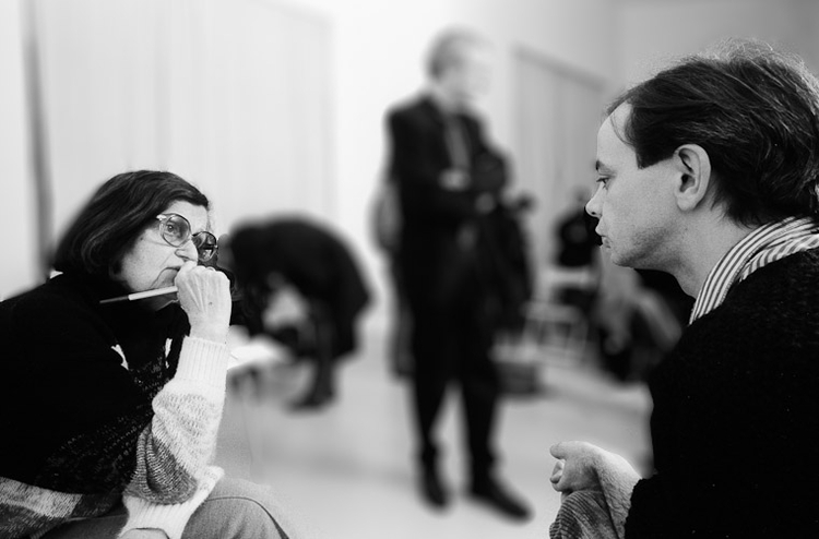 Farocki interessierte sich insbesondere für die Bewegtbildproduktion an der neuen Akademie und ließ sich von den Akademiegründern eingehend informieren, 1990.